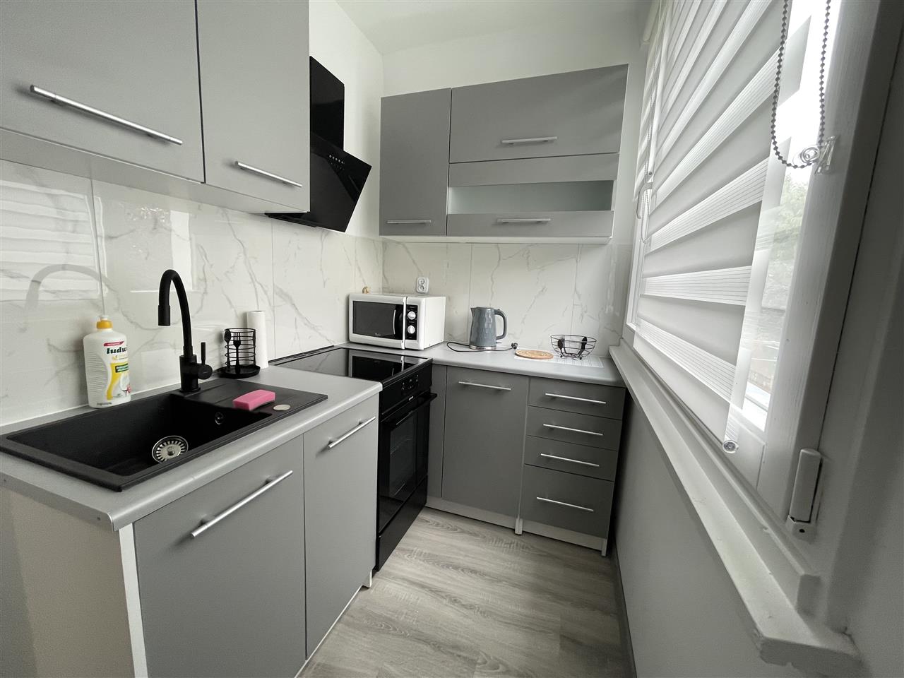 Widna oddzielna kuchnia - meble kuchenne + AGD (piekarnik, lodówka, płyta indukcyjna, zlewozmywak, okap, mikrofalówka).