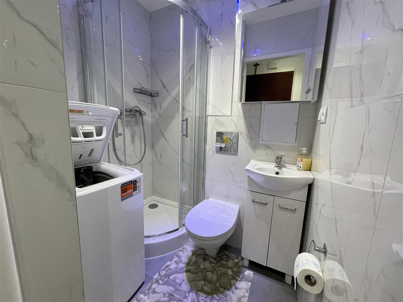 Łazienka - prysznic, umywalka, miejsce na pralkę, toaleta.