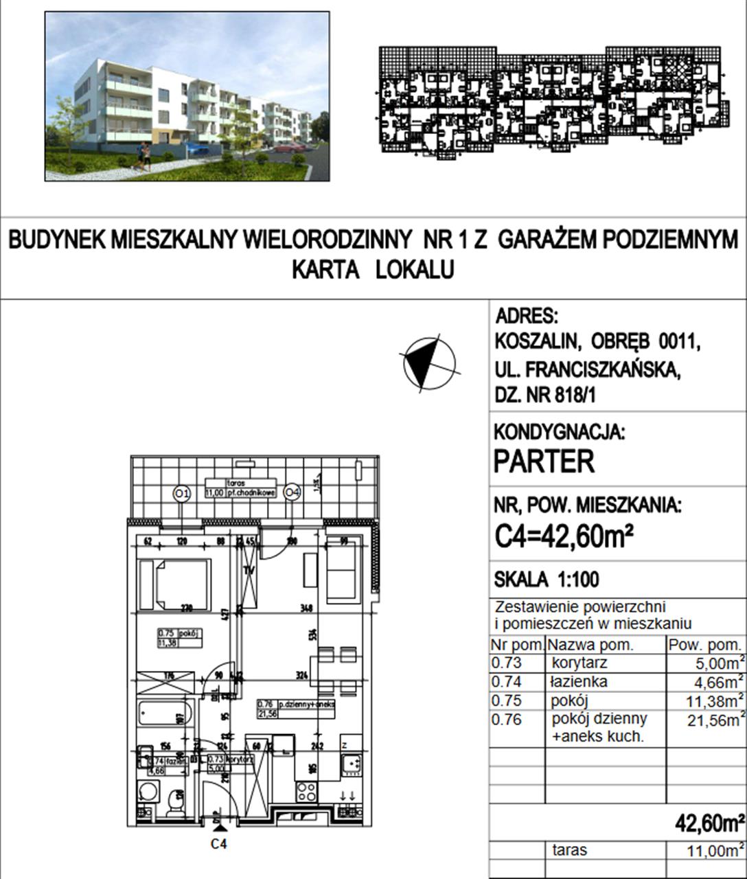 Prezentowanie mieszkanie posiada 2 pokoje (salon z aneksem kuchennym 21,56m2, pokój 11,38m2), łazienkę (4,66m2), korytarz (5,00m2) oraz taras (11,00m2). Położone jest na parterze od strony wschodniej. Dostępne od listopada 2025r.