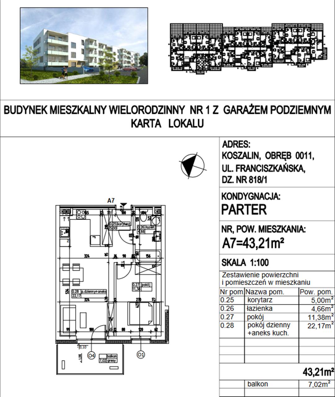 Prezentowanie mieszkanie posiada 2 pokoje (salon z aneksem kuchennym 22,17m2, pokój 11,38m2), łazienkę (4,66m2), korytarz (5,00m2) oraz balkon (7,02m2). Położone jest na parterze od strony zachodniej. Dostępne od listopada 2025r.
