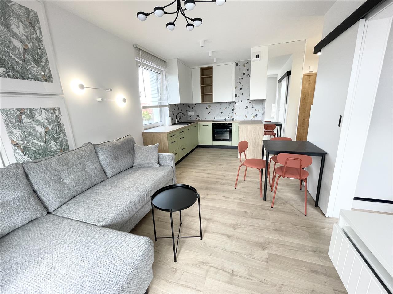 Salon z aneksem kuchennym - sofa, stolik kawowy, stolik kuchenny z trzema krzesłami, meble kuchenne + AGD (piekarnik, zmywarka, lodówka, okap, płyta indukcyjna).