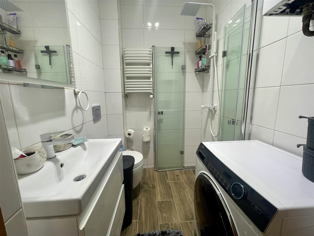 Łazienka - prysznic, umywalka, nowa pralko-suszarka, toaleta.
