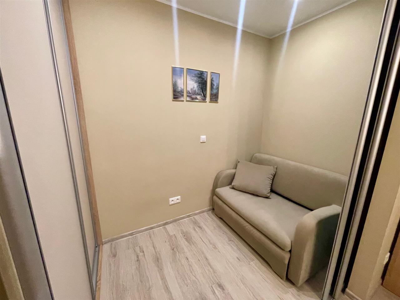 W dużym pokoju znajduję się część sypialniana z dużą szafą w stałej zabudowie oraz rozkładanym łóżkiem.