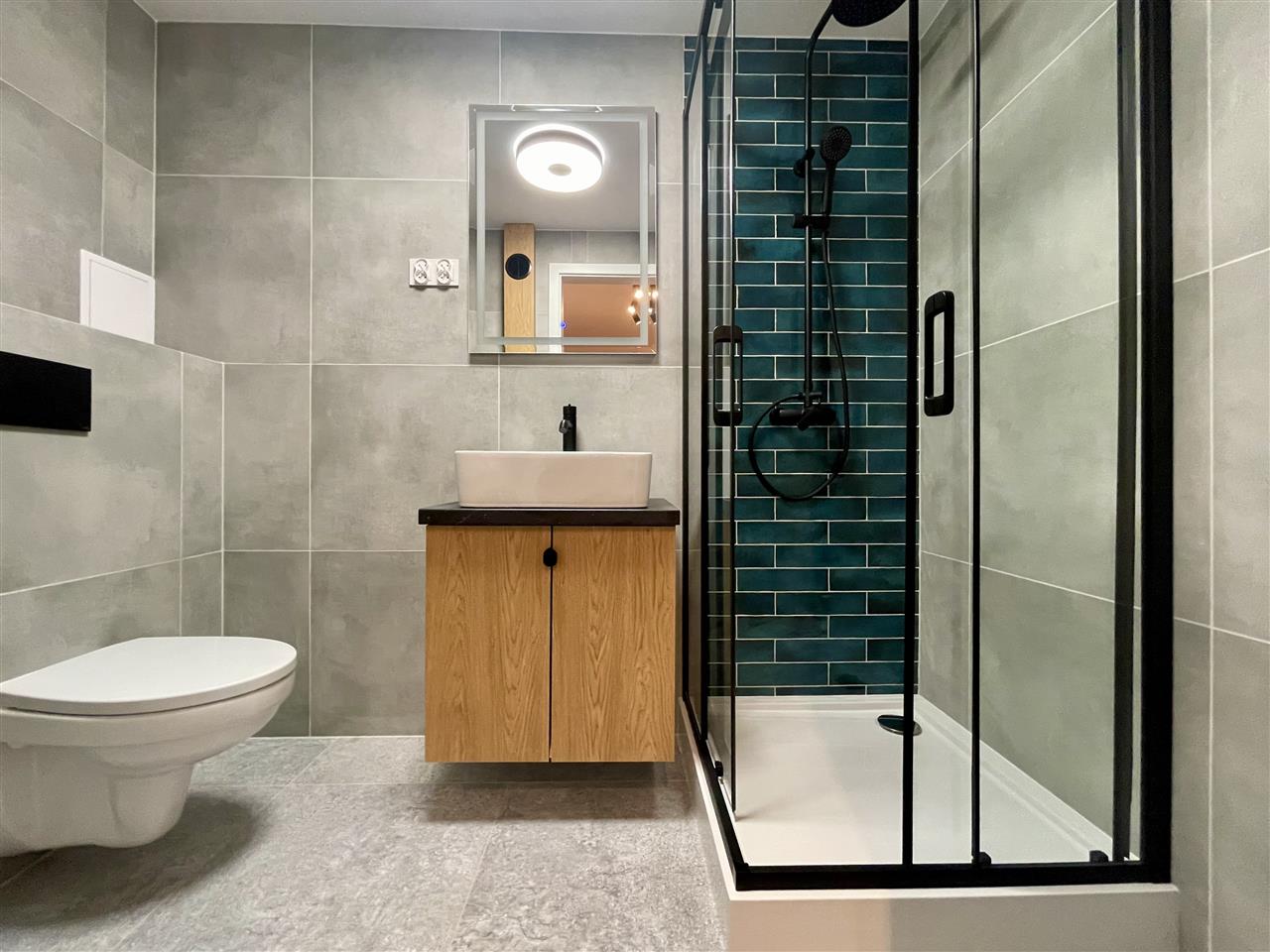 Łazienka - na podłodze szara terakota, na ścianach szare płytki, stylowy prysznic, stelaż podtynkowy GEBERIT, szafka łazienkowa na zamówienie (zlew postawiony na blacie), duże podświetlane lustro, oświetlenie