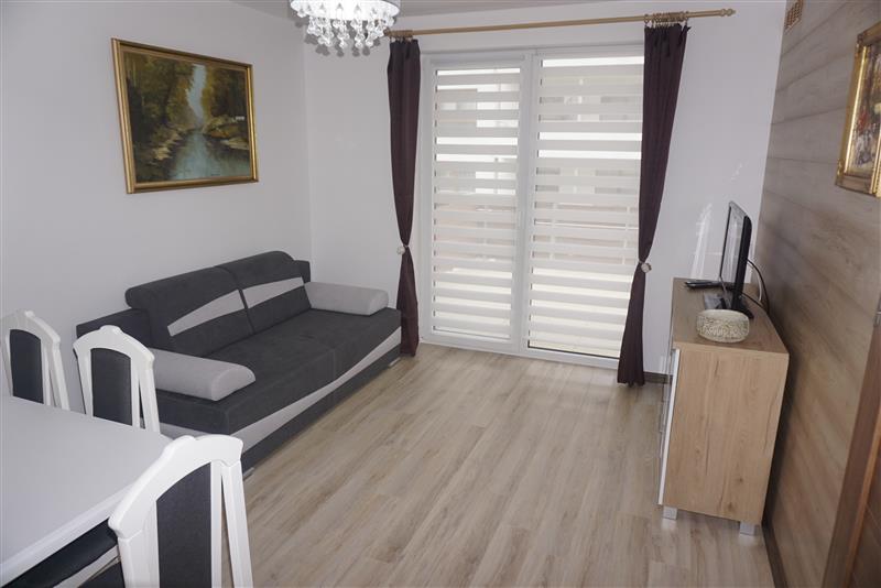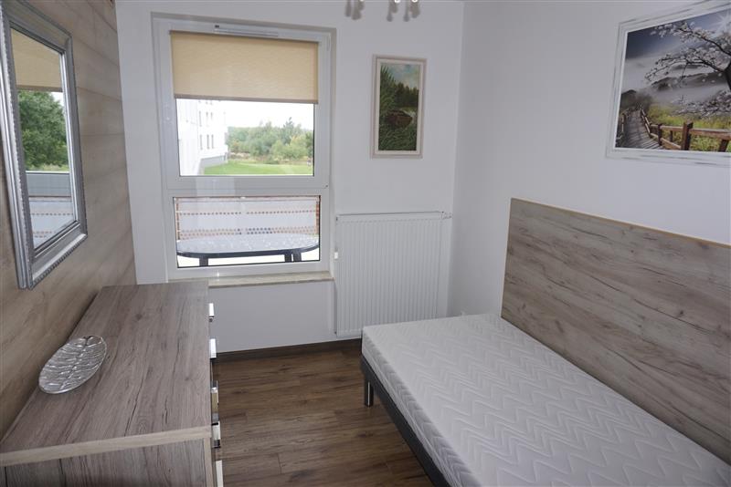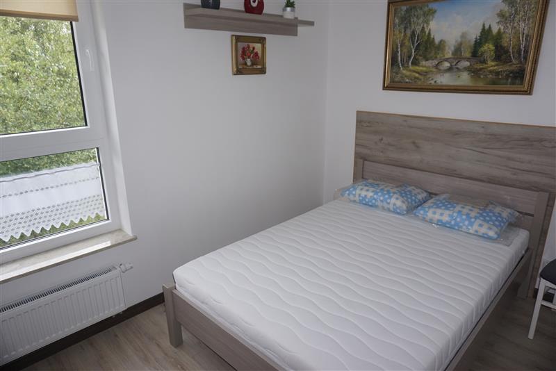 W pokojach na ścianach gładzie, na podłodze panele, wyposażone w m.in.: szafy, łóżka, telewizor, komody, stół.