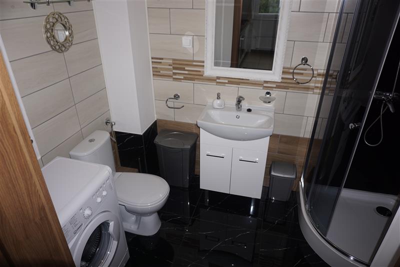 W łazience terakota, glazura, kabina prysznicow, pralka . Okna PCV, taras.