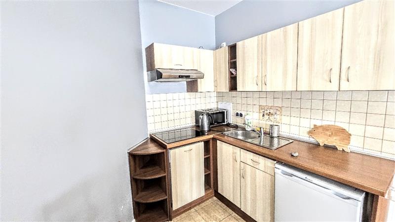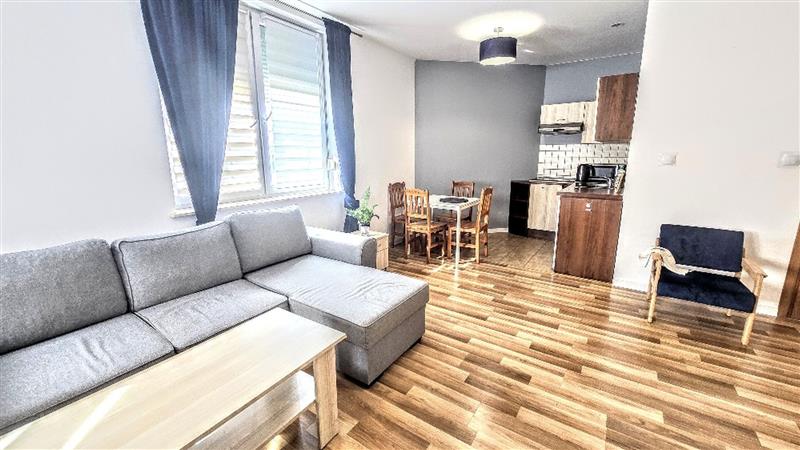 Bardzo ładnie doświetlony. W oknach żaluzje. Kuchnia zabudowa kuchenna, płyta indukcyjna, lodówka, mikrofala, czajnik elektryczny, stół, krzesła.