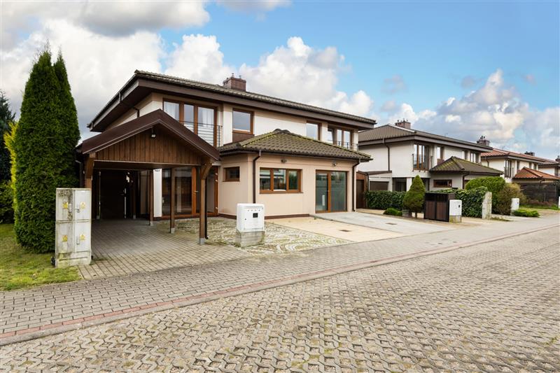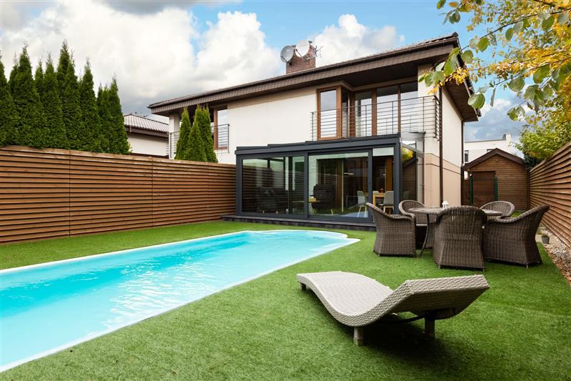 Dom jednorodzinny z BASENEM i OGRODEM ZIMOWYM, zabudowanym wiatrołapem w zabudowie bliźniaczej.