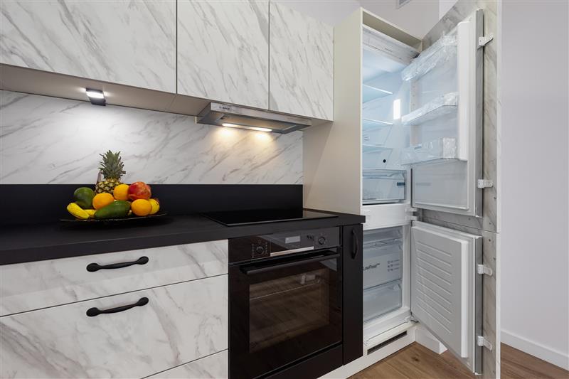 Lokal został wykończony pod klucz, z wysokiej jakości materiałów. Drzwi marki Dewro, włoskie płytki Marazzi i Imola w łazience i na podłogach w całym mieszkaniu, kuchnia oraz inne meble firmy Haecker, nowy sprzęt AGD w kuchni marki Bosch/Siemens, ceramika Duravit, oświetlenie Nowodvorski i AQform.