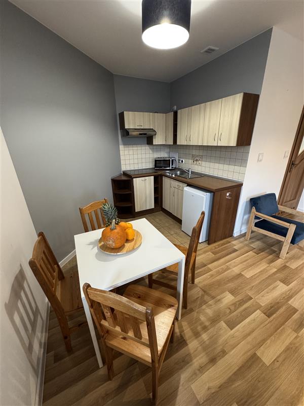 Nowoczesny aneks kuchenny w pełni wyposażony: zabudowa kuchenna, płyta indukcyjna, lodówka, mikrofala, czajnik elektryczny, stół i krzesła,