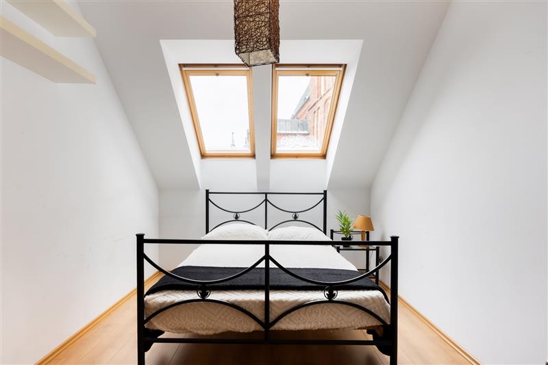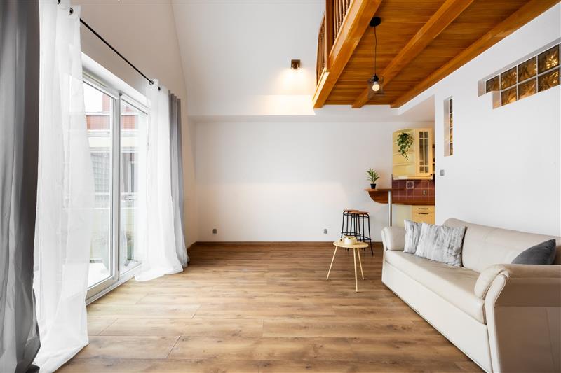 Balkon wychodzi na zamknięte atrium, co sprawia, że mimo lokalizacji w samym centrum miasta mieszkanie pozostaje spokojne i ciche. Nie dociera tu hałas uliczny ani intensywny ruch miejski, dzięki czemu można odpocząć w komfortowych warunkach.