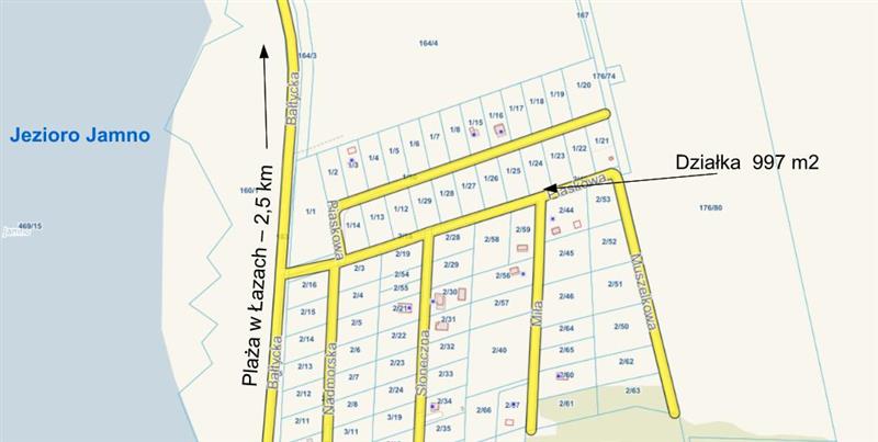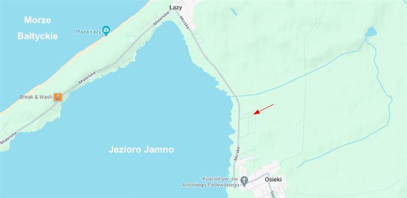 Działka budowlana o pow. 997 m2, Osieki (2,5 km od plaży bałtyckiej w Łazach). Nieruchomość przeznaczona w Miejscowym Planie Zagospodarowania Przestrzennego pod zabudowę mieszkaniowo - rekreacyjna i drogę.