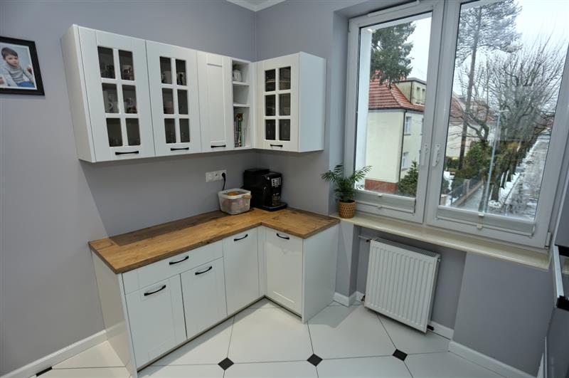 Kuchnia jest funkcjonalna i jasna, białe meble z drewnianym wykończeniem, nadają wnętrzu elegancji. Wyposażona jest w dobrej jakości sprzęty: lodówka, piekarnik, zmywarka, co zapewnia wygodę i ułatwia codzienne gotowanie.