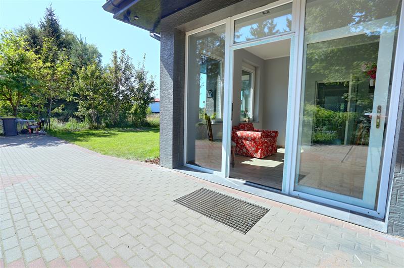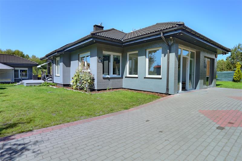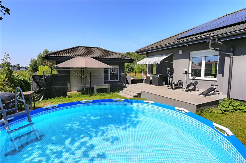 Dom posadowiony jest na działce o powierzchni 919 m2. Teren w pełni ogrodzony, z licznymi nasadzeniami – krzewami, drzewami i roślinnością ozdobną. Na posesji znajduje się także basen stelażowy, idealny na letnie dni.